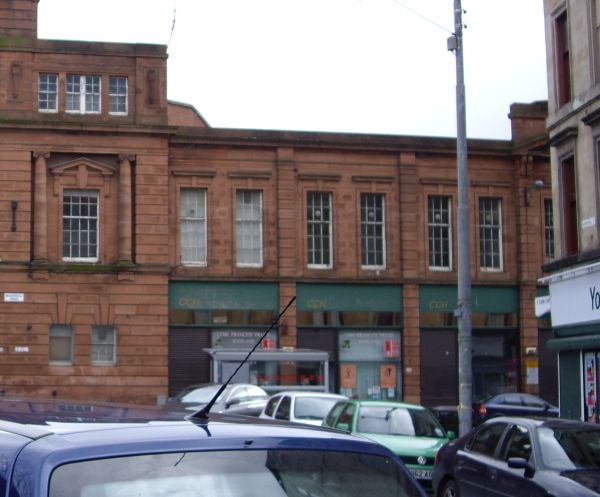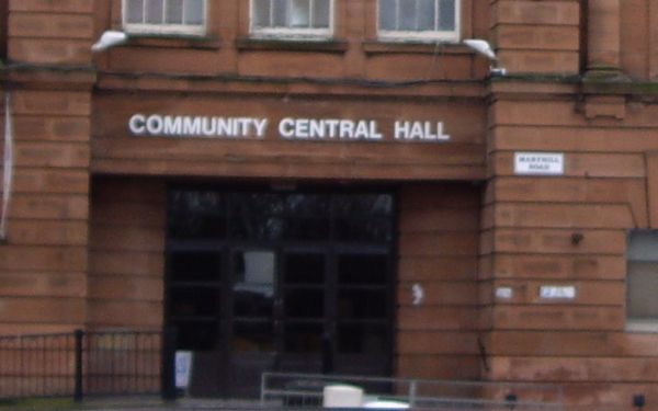 Community hall on Maryhill Rd with older doors, made up to look like a cinema: